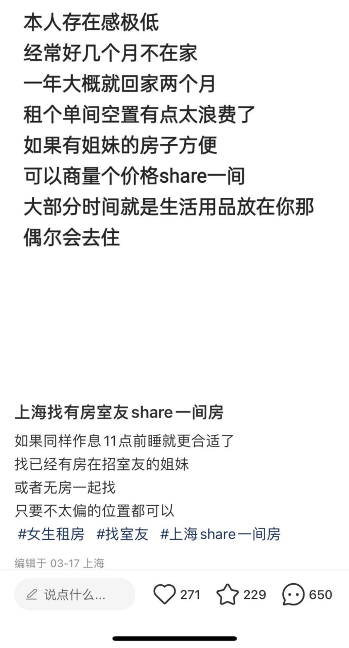 但从帖子的热度来看,招租帖少有人问询,求租帖的底下常有数百条自荐房源信息的评论,显然“share一张床”这样的租赁模式在上海租房市场明显是供过于求。