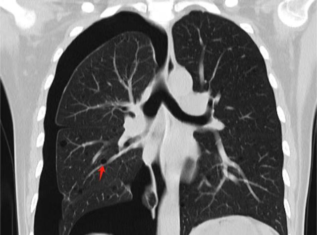 (▲术前胸部CT显示:右侧气胸,双肺囊泡样改变就像一个个大小不一的”肥皂泡“(如箭头所示))
