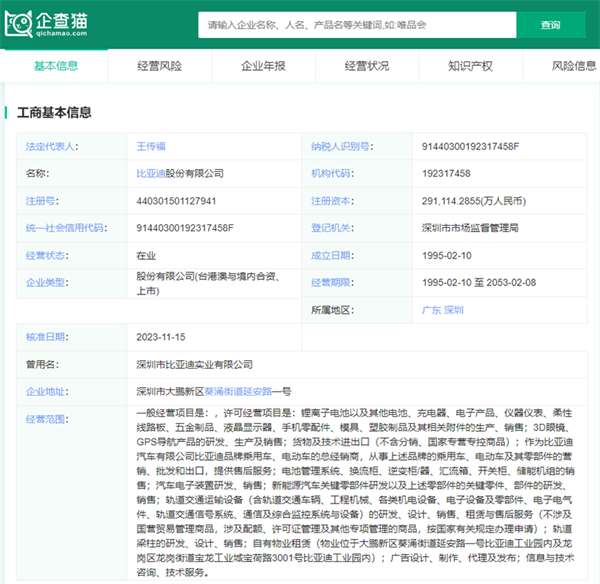 据企查猫资料显示,比亚迪股份有限公司成立于1995年,法定代表人为王传福,注册资本约为29亿元人民币,经营范围包括锂离子电池以及其他电池的生产及销售;车关键零部件研发以及上述零部件的关键零件、部件的研发与销售等等。
