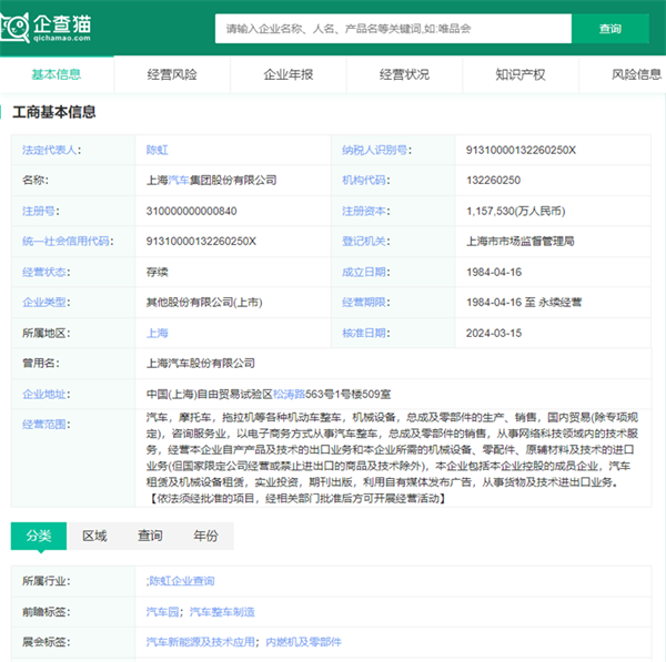 据企查猫资料显示,上海汽车集团股份有限公司成立于1984年,法定代表人为陈虹,注册资本约为115亿元人民币,经营范围包括汽车;摩托车;拖拉机等各种机动车整车;机械设备、总成及零部件的生产、销售等。