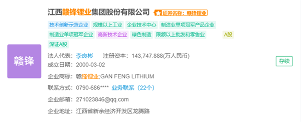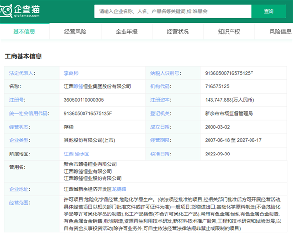 据企查猫资料显示,江西赣锋锂业集团股份有限公司成立于2000年,法定代表人为李良彬,注册资本约为14亿元人民币,经营范围包括电池制造;资源再生利用技术研发;新材料技术推广服务;工程和技术研究和试验发展等。