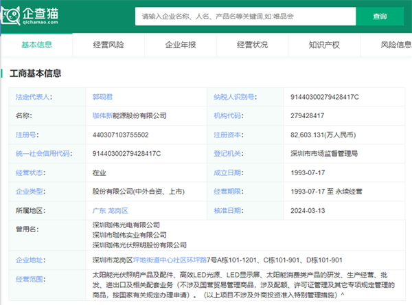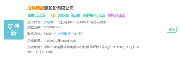 据企查猫资料显示,珈伟新能源股份有限公司成立于1993年,法定代表人为郭砚君 ,注册资本约为8亿元,经营范围包括太阳能光伏照明产品及配件;高效LED光源、LED显示屏、太阳能消费类产品的研发等。