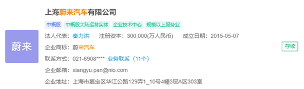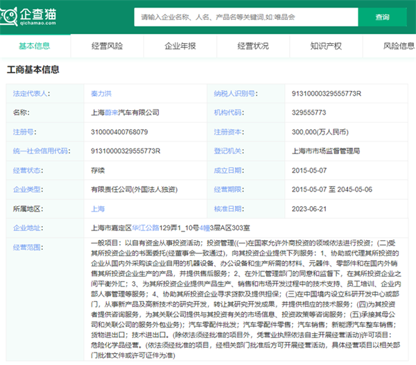 据企查猫资料显示,上海蔚来汽车有限公司成立于2015年,法定代表人为秦力洪,注册资本约为30亿元,经营范围包括汽车零配件批发;汽车零配件零售;汽车销售;新能源汽车整车销售;货物进出口;技术进出口等。