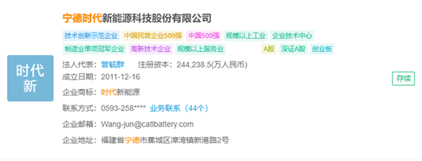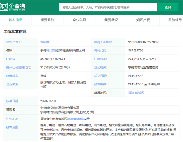 据企查猫资料显示,宁德时代新能源科技股份有限公司 成立于2011年,法定代表人为曾毓群,注册资本约为24亿元人民币,经营范围包括锂离子电池;锂聚合物电池;燃料电池;动力电池等。