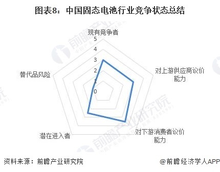 目前,我国固态电池是新兴动力电池,替代品威胁小;现有竞争者数量逐渐增多;正极、负极材料供应较为充足,对这部分上游材料议价能力较强,而固态电解质技术门槛高,研发难度大,故议价能力弱。而随着下游应用领域对于动力电池产品性能要求的提升,固态电池市场需求空间正在逐步扩大,下游议价能力正在逐渐增强;同时,因行业存在资金、技术门槛较高,潜在进入者威胁较小。