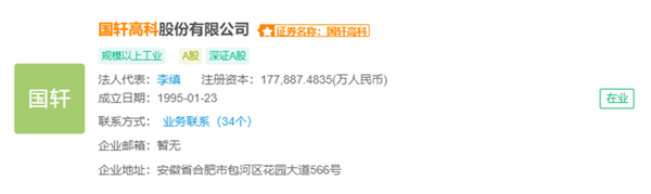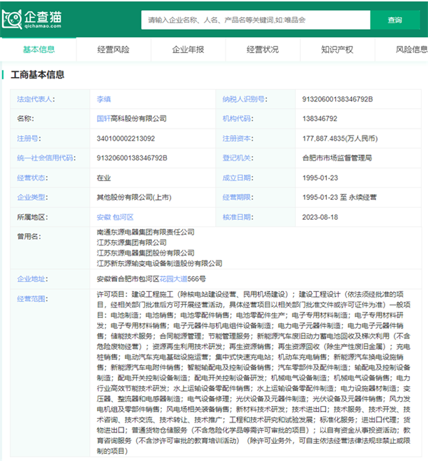 据企查猫资料显示,国轩高科股份有限公司成立于1995年,法定代表人为李缜,注册资本约为17亿元人民币,经营范围包括电池制造;电池销售;电池零配件销售;电池零配件生产;电子专用材料制造;电子专用材料研发等。