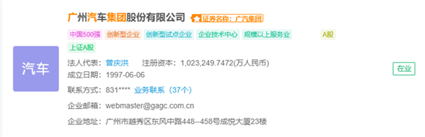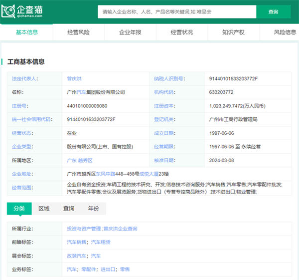 据企查猫资料显示,广州汽车集团股份有限公司成立于1997年,法定代表人为曾庆洪,注册资本约为102亿元人民币,经营范围包括企业自有资金投资;车辆工程的技术研究、开发等。
