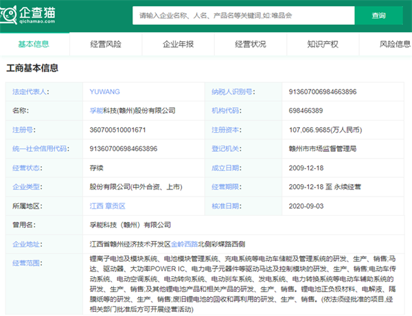 据企查猫资料显示,孚能科技(赣州)股份有限公司成立于2009年,法定代表人为YUWANG,注册资本约为10亿元,经营范围包括锂离子电池及模块系统;电池模块管理系统;充电系统等电动车储能及管理系统的研发、生产、销售等。