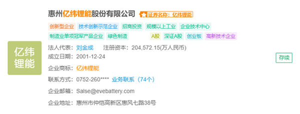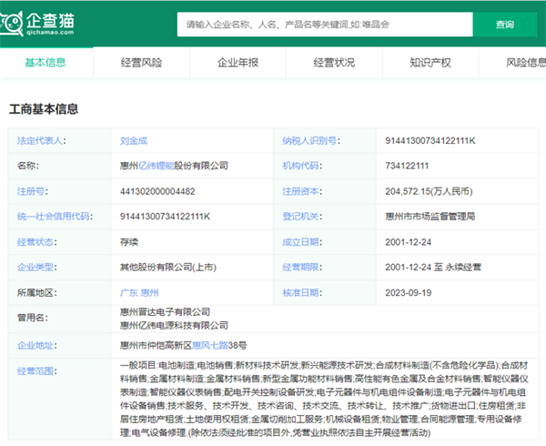 据企查猫资料显示,惠州亿纬锂能股份有限公司成立于2001年,法定代表人为刘金成,注册资本约为20亿元人民币,经营范围包括电池制造;电池销售;新材料技术研发;新兴能源技术研发等。