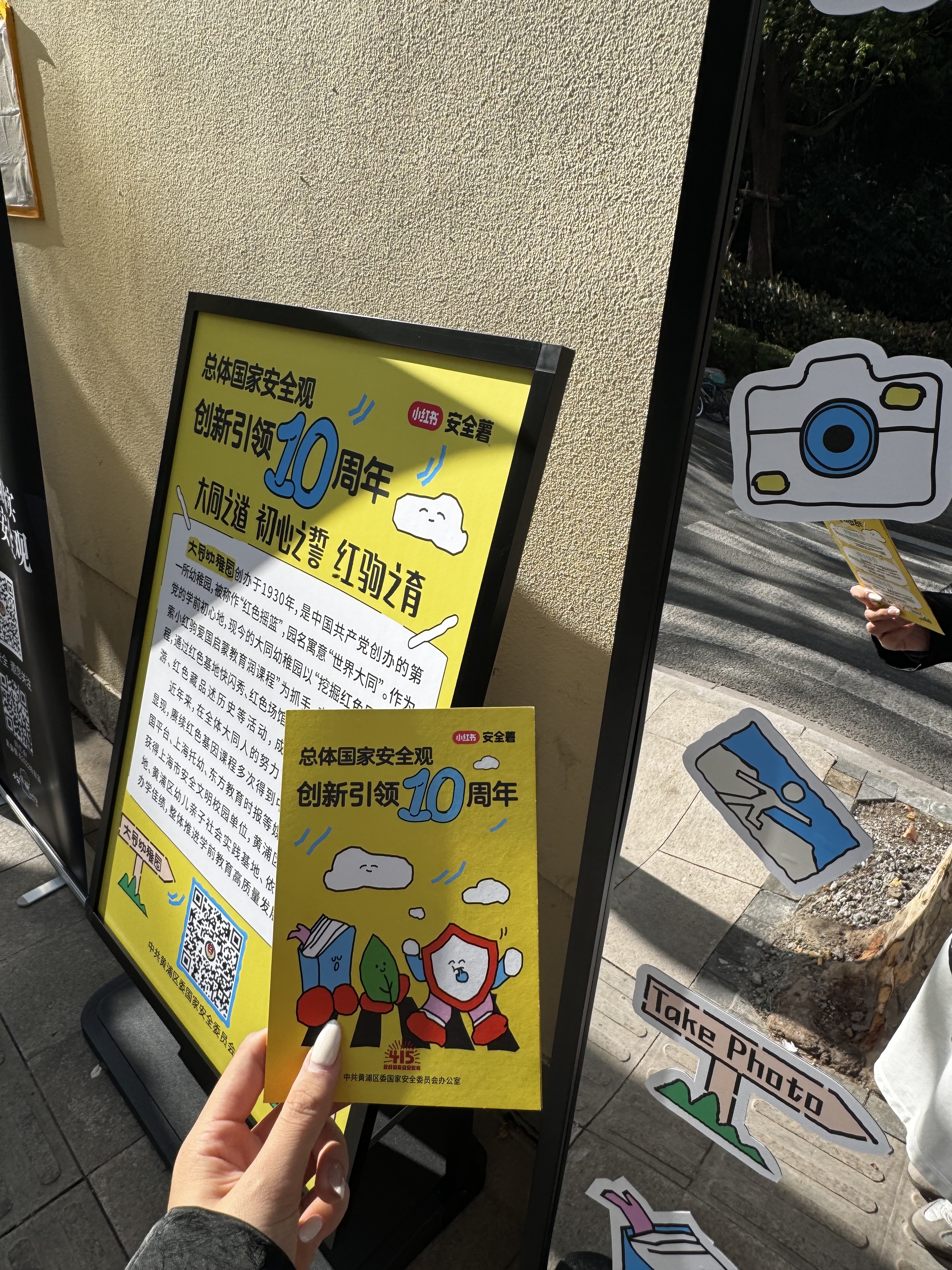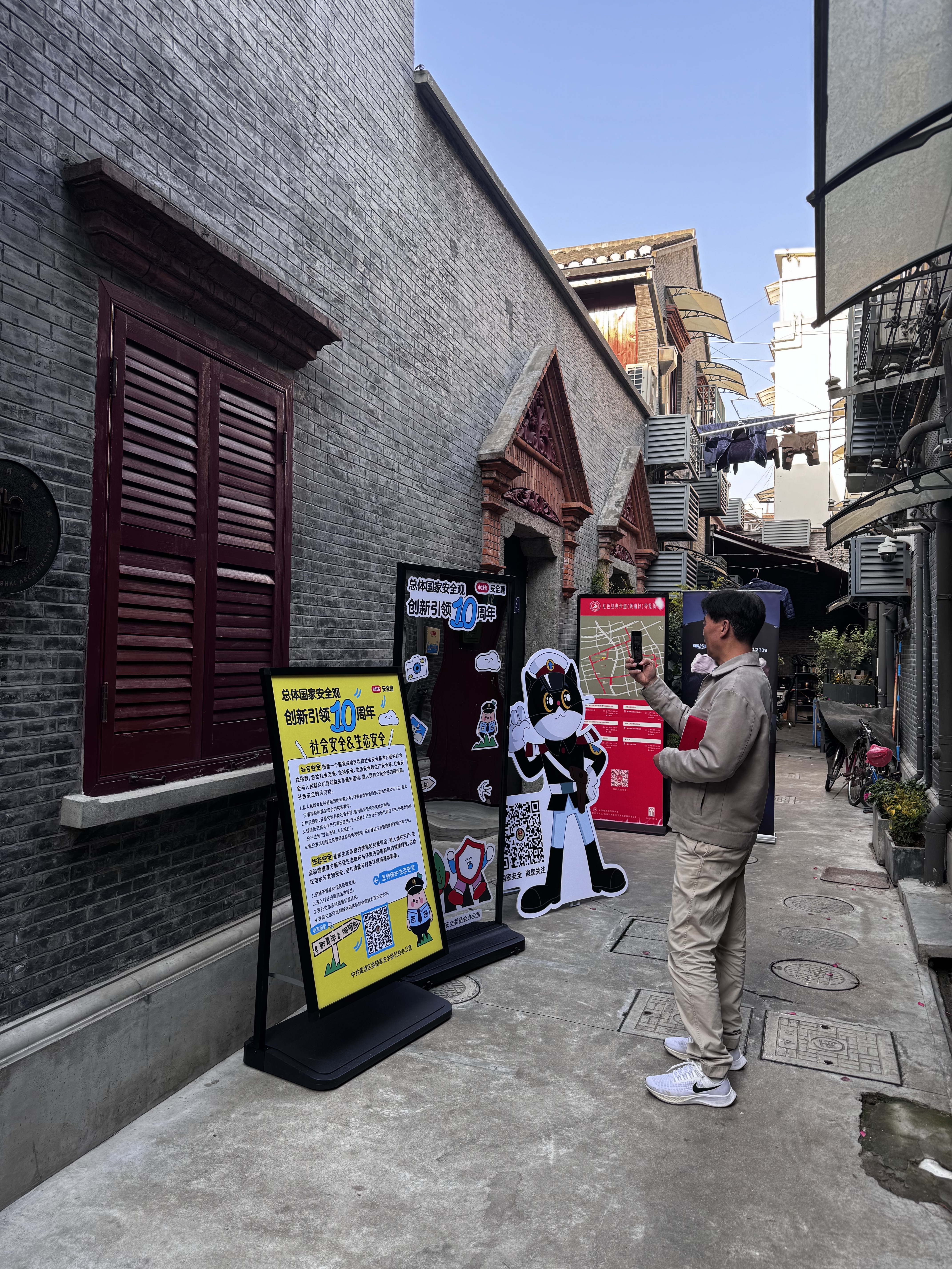 以大同幼稚园为起点,黄浦区一批青年群体开启了“国家安全Citywalk”,学校师生共同参与“行走的国家安全思政课”活动,打卡区域红色地标、学习国家安全知识,在沉浸式教育中传承红色基因、永担国安使命。政法干警、学校师生、社区群众、楼宇白领等各界代表,从百年南昌路上的《新青年》编辑部旧址出发,途经思南路周公馆、黄陂南路上海金融博物馆、兴业路中共一大会址等10余个点位,队员们在每个点位设置的“政治安全、社会安全、金融安全、经济安全、科技安全、网络安全、人工智能安全、生物安全”等宣传海报前打卡学习,与参观瞻仰红色场馆完美结合,在“身临其境”中传承红色基因,在“沉浸式教育”中普及国安知识,在“志愿讲解”中提升防范意识,既体悟红色文化,又厚植国安情怀。最后,队员们汇聚在复兴公园马恩塑像广场前,与市民群众一起交流互动,共同开展国家安全知识竞猜,交流互动、寓教于乐,将所学国安知识内化于心、外化于行。