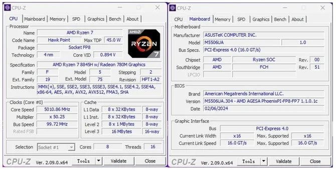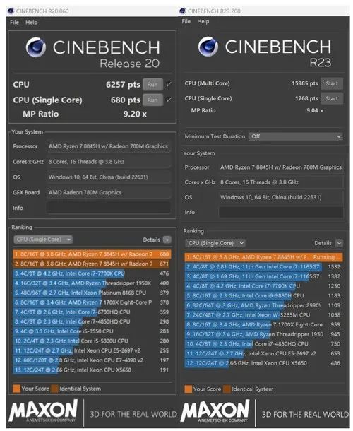 CINEBENCH R20 测试的结果可见,单核成绩 680 pts,多核成绩 6257 pts;R23 的单核成绩 1768 pts,多核成绩 15985 pts。综合来看,锐龙 7 8845H 的 CINEBENCH 单核成绩跟酷睿 Ultra 7 155H 相当,多核成绩对比酷睿 Ultra 5 125H 高出约18-20%,性能表现相当不错。
