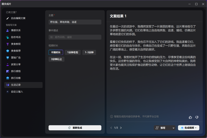 而在剪映应用里,你可以使用AI生成文案,继而转换为视频,稍作修改后就能完成需要的视频并发布了,所以,这里一方面是文案的创作,一方面是视频的生成,这相比一个人的苦思幂想可要简单的多、高效的多了。