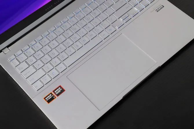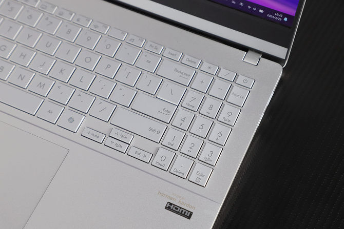 15.6 英寸的屏幕,让华硕无畏 Pro15 2024 的机身有足够的空间来设计键盘和触控板,所以不仅搭载了全尺寸键盘,按键的键程也达到1.7mm ,打字时的反馈清晰,回弹迅速,而且还在键帽上设计了0.2mm 的下凹弧面,更加贴合指腹。19.05mm 的大键距,避免误触,准确打字不迷路。