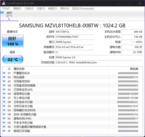 硬盘存储方面,无畏 Pro15 2024 搭配的是一款三星 1TB SSD,型号为 MZVL81T0HELB,PCIe 4.0 NVMe 2.0,支持 SMART、TRIM 功能。