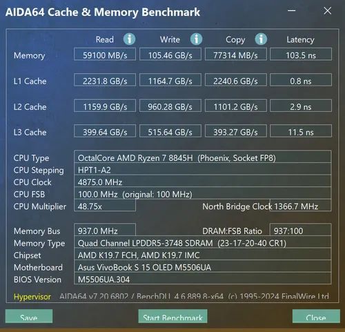 使用 AIDA64 内存性能测试可见,读取速度 59100 MB/s,写入速度 105.46 GB/s,Copy 77134 MB/s,延时 103.5ns。性能上处于较高水平,可以满足多任务处理的需求。