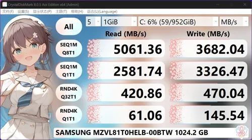 传输速度方面,顺序读、写速度分别为 5061 MB/s、3682 MB/s,性能方面也完全够用,1TB 的容量也可以满足日常办公、学习或创作的需要。