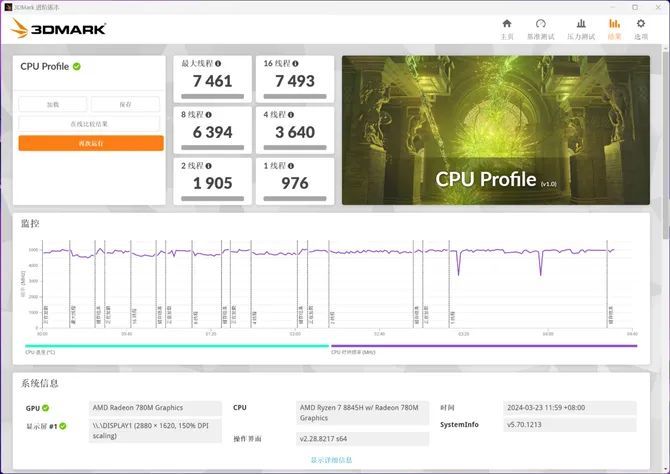 针对 CPU 多线程性能的测试,使用 3DMark CPU Profile 可以测试单线程、双线程到最大线程的评价。结果可见,锐龙 7 8845H 的最大线程得分为 7461 ,大核大显的优势依然不错。