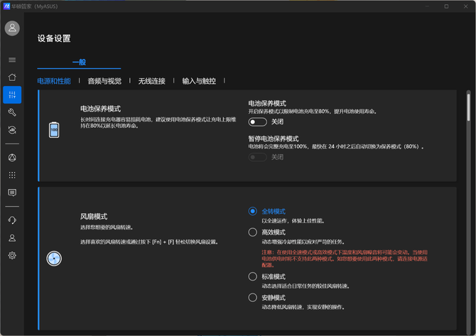 *在以下的测试项目前,均已将系统、华硕管家、主板 BIOS 等软硬件升级至最新版本,系统电源设置为最佳性能,华硕管家的风扇模式设置为全速模式,在此模式下,整机性能可最大释放,风扇全速运转以确保整机稳定。