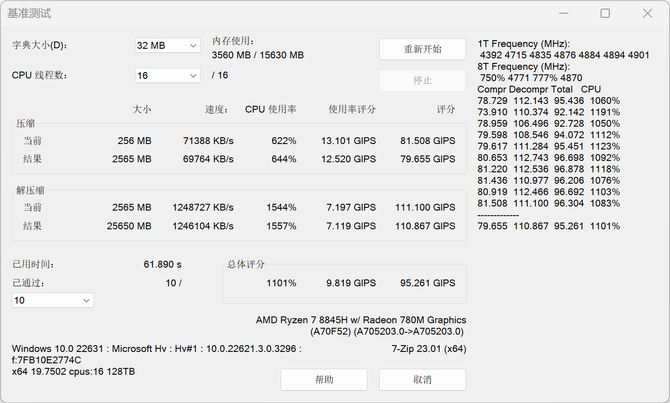 压缩解压缩是我们比较常用的操作,7-Zip 内置的基准测试,通过多轮压缩解压缩,能够评估 CPU 性能并给出总体评分。95.261 GIPS 意味着无畏 Pro15 2024 可以胜任更大文件的压缩解压缩,效率也更高。