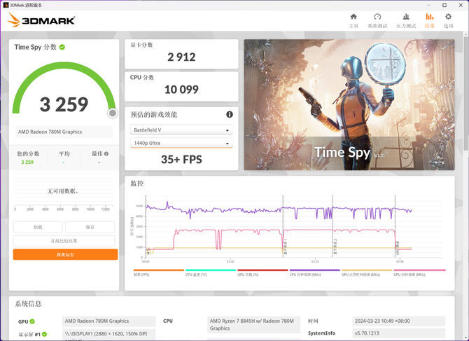 DX12 环境 2K 分辨率的 3DMark Time Spy 测试中,显卡得分 2912,综合得分 3259。
