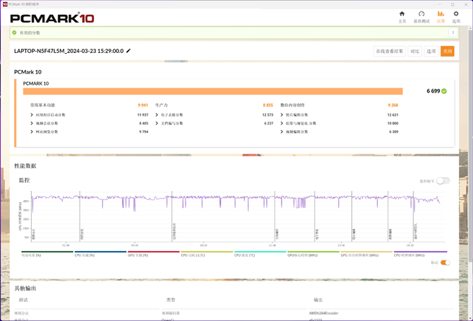 PCMark 10 能够对日常各种办公、创作等的场景进行模拟,并对各个详细的项目进行打分,以此可以对比该笔记本电脑在某个方面具有更好的能力。测试的结果可见,无畏 Pro15 2024 的常用基本功能得分为 9941,生产力得分为 8855,数位内容创作得分为 9268。PCMark 10 测试的综合得分为 6699,在生产力方面,锐龙 7 8845H 处理器同样得心应手。