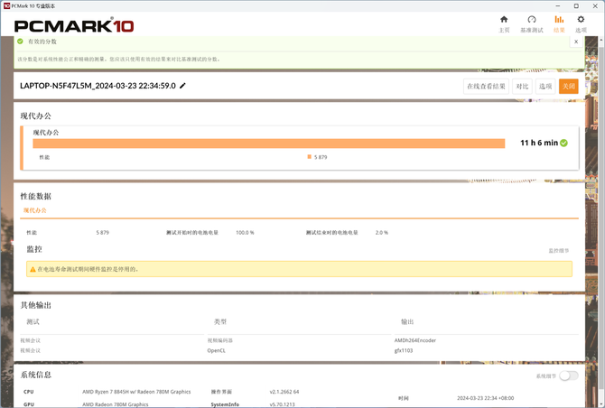 最终的结果可见,11 小时 6 分钟的续航,外出移动办公,100% 满电的情况下无需为续航担心,轻松应对一整天。