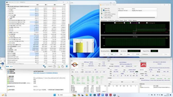 首先来看看锐龙 7 8845H 处理器在无畏 Pro15 2024 笔记本上的功耗表现,室内温度 20°C,使用 AIDA64 的 Stress FPU 进行测试,连续运行 20 分钟,CPU 封装功耗 54W,核心温度 84.7°C。在高负载下,双导热管以及全速风扇提供了强大的散热效率,可以满足高强度的游戏、创作需求。