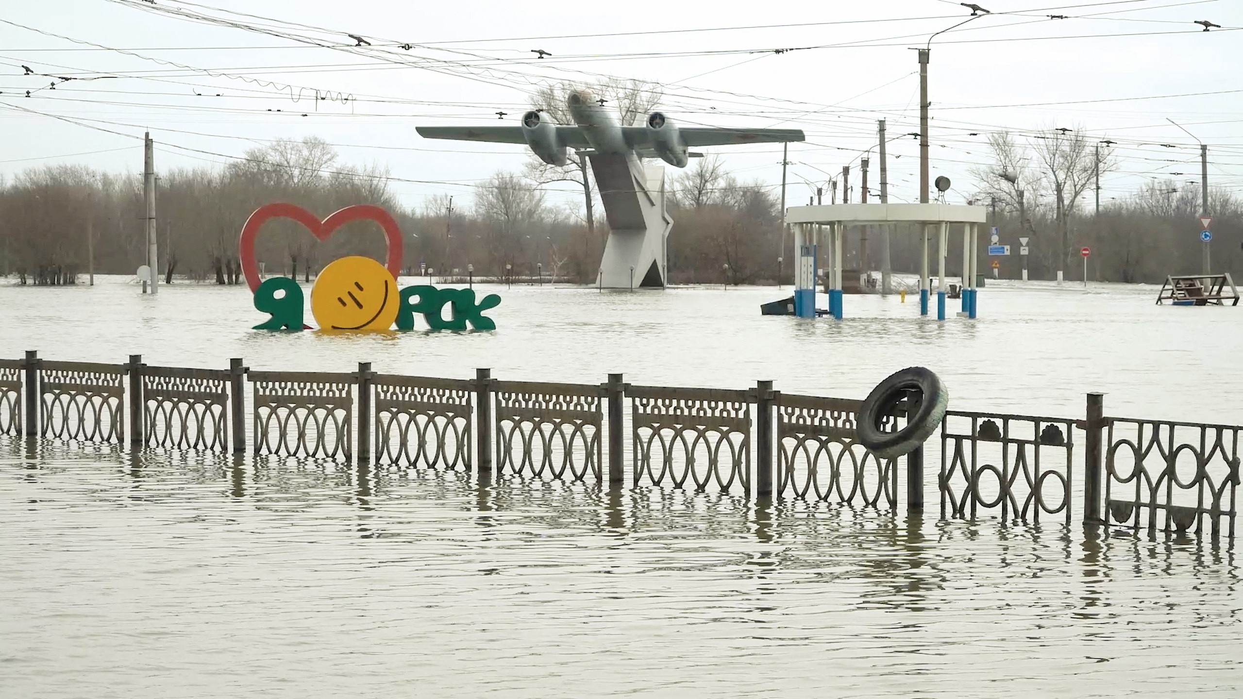 4月9日的视频截图显示,俄罗斯奥尔斯克市一处公共设施被洪水淹没。