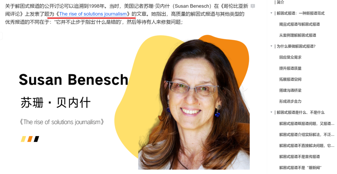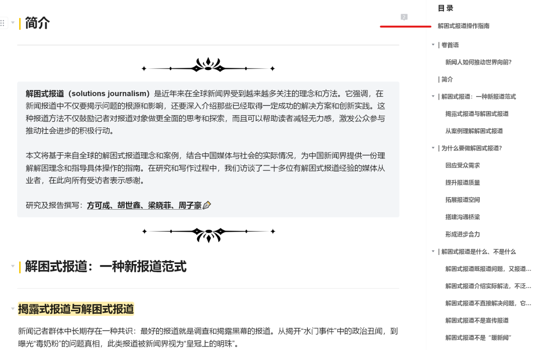 但也必须指出,beta版《操作指南》也非常有价值,这一版的《操作指南》系统考察了解困式报道在国内外的最新实践,并访谈了20余位供职于国内主流媒体、并有解困式报道创作经验的新闻从业者,相当完整地回答了当前新闻从业者关于解困式报道的困惑,比如,解困式报道是什么,不是什么?为什么要做解困式报道?一篇成功的解困式报道包括哪些要素?文中既有通俗易懂的理论阐释,更列举了大量的新闻案例,甚至有具体的技术操作指引。我们十分确定:对于认同解困式报道的新闻从业者,无论是新人还是老手,这一小册子都将为你提供许多启发。