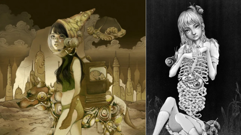 立体雕塑作品之外,陈嫣冉还带来多幅原画及作品。《我和我的朋友ME AND MY FRIEND》以超现实主义的手法,呈现想象力爆炸的废土美学。她笔下的少女穿行于废土世界的荒原中,带着强烈的不安定感观望世界。新作《蜗牛与女孩GIRL AND SNAIL》则继承本人对具身知觉的关注,诠释人类对自我的沉思。