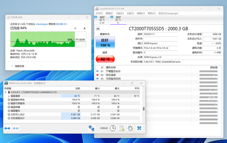 例如往这款固态硬盘里面写入大约500GB的文件,根据CrystalDiskInfo和HWiNFO这两款软件监控测得,这款固态硬盘的温度会很快突破80℃。一旦温度超过80℃之后,这款固态硬盘会便出现性能不稳的现象,有时候写入还会突然中断。
