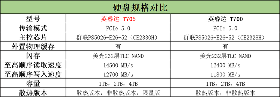 Crucial 英睿达 T705 PCIe 5.0 NVMe 固态硬盘可以看作是英睿达 T700的升级款产品。这两款固态硬盘到底有哪些区别,笔者列出了一张对比表格,大家一看便知。
