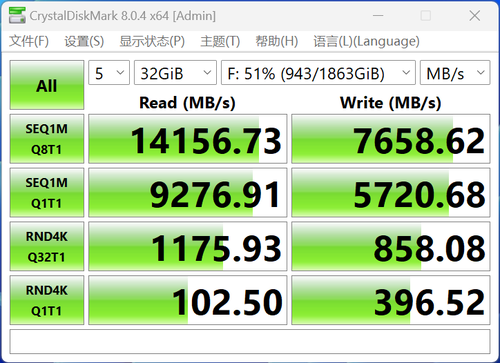 此时,Crucial 英睿达 T705 PCIe 5.0 NVMe 固态硬盘2TB的连续读取性能依旧能够超过14100 MB/s。但连续写入性能衰退明显,降至约7658 MB/s。