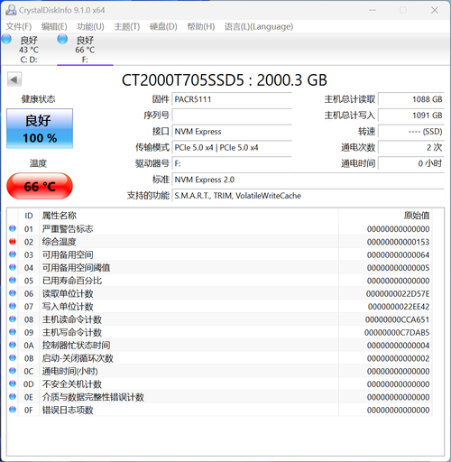 Crucial 英睿达 T705 PCIe 5.0 NVMe 固态硬盘2TB的CrystalDiskInfo信息。开机运行后,这款固态硬盘的实际容量约为1863GB。
