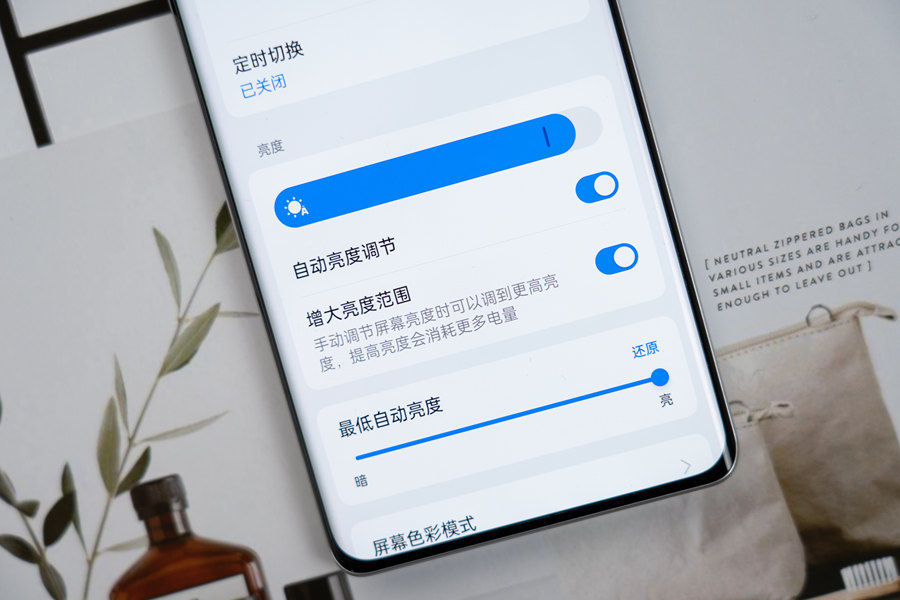 这块屏幕是真我与京东方联手打造的新一代无双屏,尺寸为6.78英寸,分辨率1.5K,局部峰值亮度达到了6000nit,全局最 高亮度1600nit,手动最 高亮度1000nit,在系统中还提供了增大亮度范围的选项,在户外强光环境下也有着优秀的显示效果。