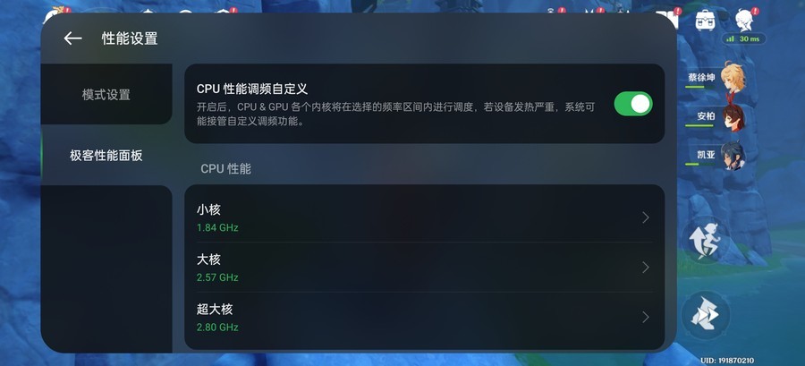 而且在极客性能面板中还支持对CPU、GPU频率的调整,让双U做到火力全开,得到更完整的性能释放,当然功耗和发热也会随之增加,建议搭配散热背夹使用,系统识别到使用散热背夹时还会自动开启燃模式,将性能拉满。该功能适配市面上主流蓝牙散热背夹,给了大家更多选择。