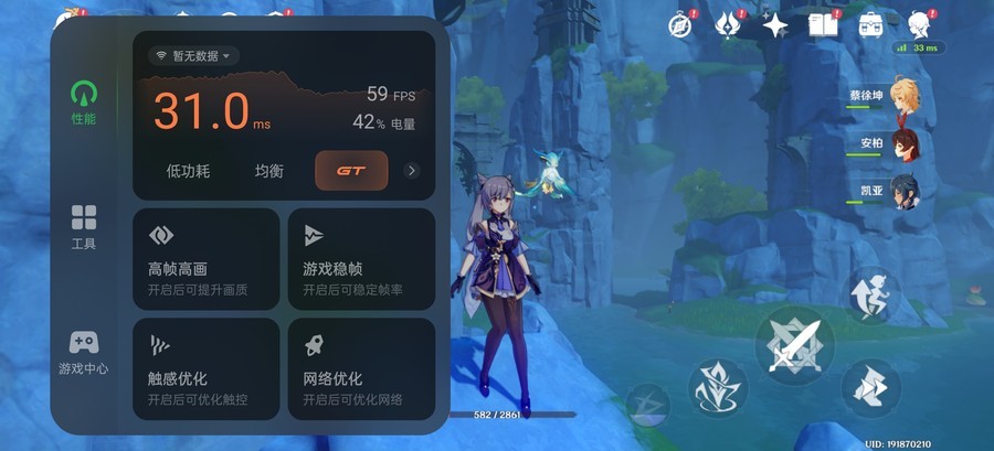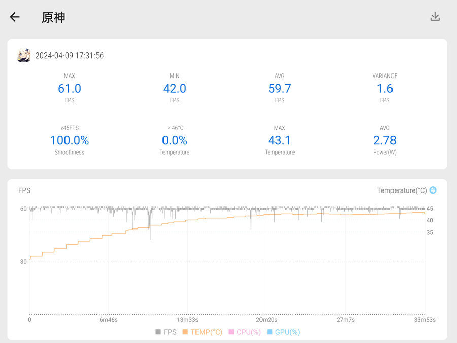 我们开启《原神》极高画质、60帧模式,进行30分钟跑图测试,测得平均帧率为59.7FPS。机内温度升至43.1℃,手机表面为温热状态,并没有感到烫手。