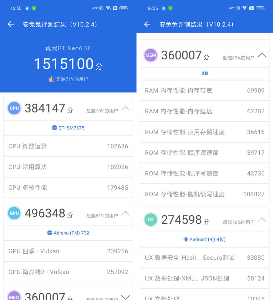 在安兔兔跑分测试中,我们这台真我GT Neo6 SE的成绩为1515100分,这样的表现足以应对日常各类使用需求,即便是《原神》这种高负载游戏也能流畅运行。