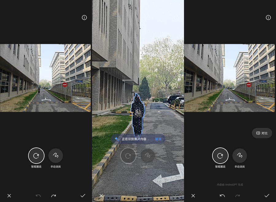 比如在相册照片编辑功能里加入了今年大热的AIGC消除,只需在需要消除的人或物上画个圈,AI就可以智能识别要消除的内容,处理后的照片如果不放大仔细观察几乎察觉不到移除痕迹,实用性很强。
