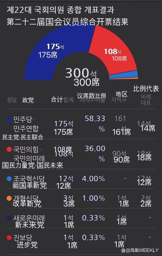 第22届韩国国会议员选举开票结果,最大在野党共同民主党及其卫星政党共赢得175个席位,执政党国民力量党只获得108个席位,祖国革新党获得12个席位。