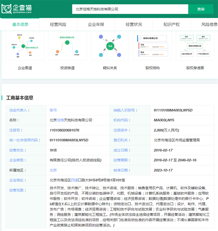 根据企查猫显示,北京佳格天地科技有限公司成立于2016年2月17日,是一家通过卫星和气象大数据收集、处理、分析和可视化系统,服务农业、环境、金融等行业的大数据应用公司,当前融资轮次为A轮。
