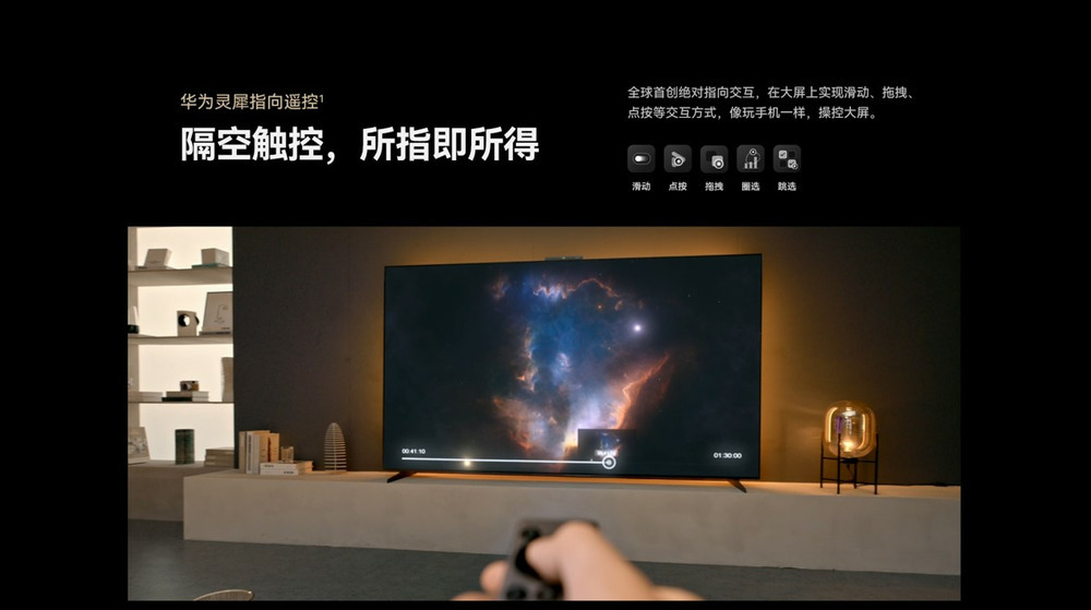 新品搭载创新的灵犀指向遥控,通过将传统遥控器按键区域整体设计为触控板,带来像玩手机一样的交互体验。用户只需简单指向,在触控板上下左右滑动手指,就能实现滑动、点按、拖拽、圈选、跳选等操作。