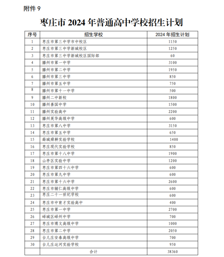 4月10日,记者从枣庄市教育局获悉,《枣庄市2024年初中学业水平考试暨高中段学校招生工作方案》发布。其中枣庄市2024年普通高中学校招生计划:各区(市)教体局按照近年毕业生数、生源数、高中学业水平考试合格率、选课走班及班额不超过50人等要素,科学制定区域内高中学校招生计划,经区(市)人民政府同意,报市教育局核准,制定《枣庄市2024年普通高中学校招生计划》,2024年枣庄市普通高中学校计划招生38360人。