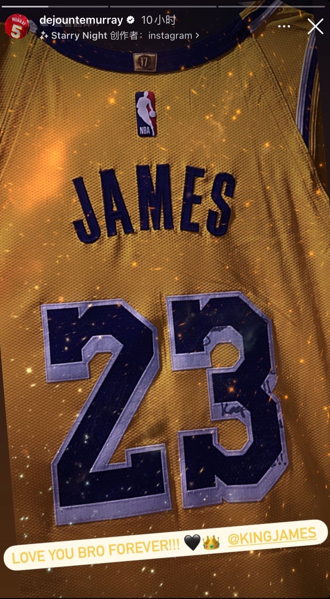 北京时间4月12日,老鹰队球员德章泰-穆雷更新社媒动态,晒出詹姆斯赠送的亲签球衣,并配文:“永远爱你兄弟。”