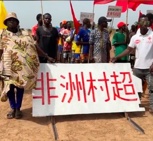 据相关动态显示,在非洲的贝宁举办了乡村足球赛,他们用中文写着“非洲村超”,比赛场地周围还插着五星红旗。