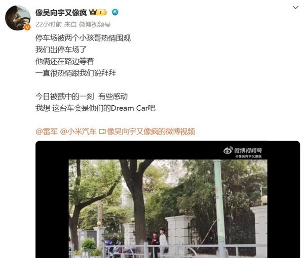 近日,知名米粉@像吴向宇又像疯 发微博称,他的小米SU7在停车场被两个小孩哥热情围观,他出停车场了,两个小米粉还在路边等着,一直很热情跟他说拜拜。他有些感动,认为这台车今后可能会是他们的Dream Car。这也说明小米SU7的确是一台现象级的电动汽车,最近的热度高居不下,连小孩都知道。