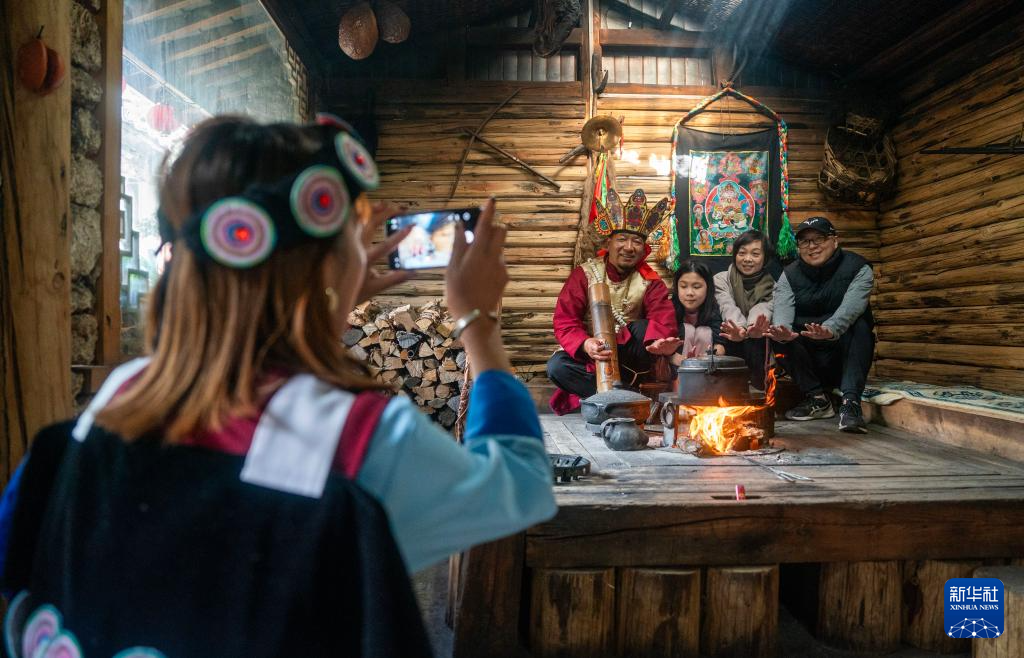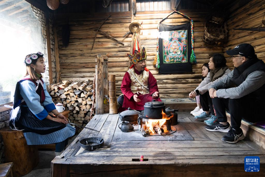 和杰林(左二)和女儿和玉月(左一)在家中的火塘边为游客介绍纳西族传统文化(3月27日摄)。