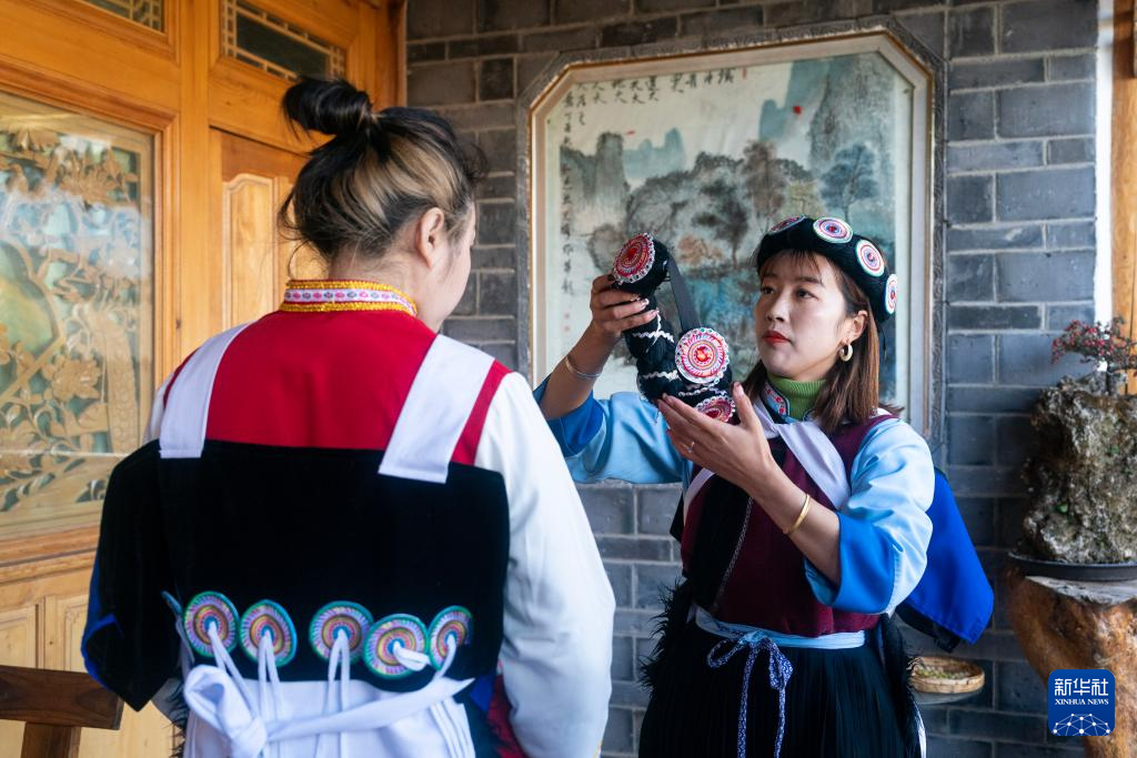 和玉月(右)在家中帮助游客穿戴纳西族传统服饰(3月27日摄)。