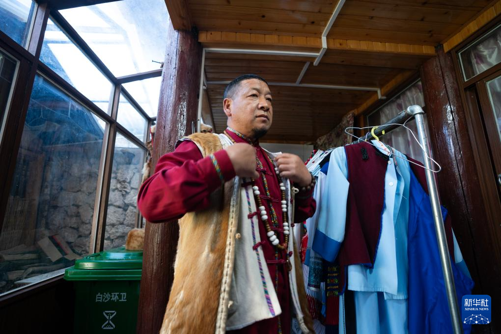 和杰林在家中更换纳西族传统服饰(3月25日摄)。