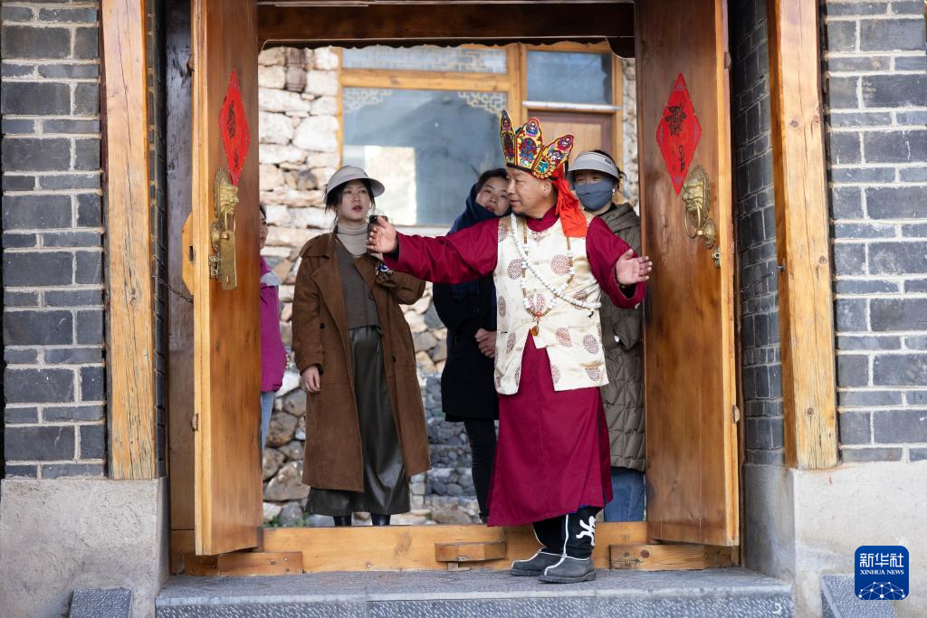 和杰林迎接游客到家中参观,在家门口介绍东巴文门联(3月27日摄)。